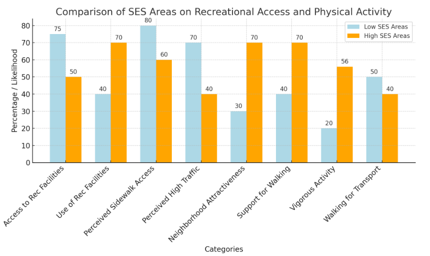 After adjustment, respondents living in low SES areas were 36% less likely to undertake vigorous activity. While they were more likely to walk for transport, this was not statistically significant (OR, 1.27; 95% CI, 0.98-1.64), nor were other SES differences in walking for recreation and walking as recommended. (Source: https://pubmed.ncbi.nlm.nih.gov/12460528/)
